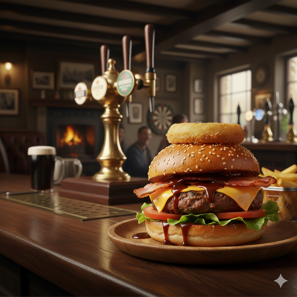 Dans notre pain burger du boulanger, nous vous servons un beau steak haché boucher avec salade, tomates et pickles, une formidable sauce à la bière stout, du veritable bacon anglais , une rondelle d’onion ring traditionnel et une généreuse tranche de cheddar fumé mature bien coulant. .